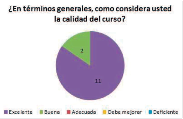 Finalmente, como se muestra el Gráf. 5, donde se evalúa la calidad final del curso, el 84,62% de los participantes que respondieron la encuesta Colles del programa de nivelación el curso dice que es excelente, con esta apreciación, se puede inferir que el diseño, elaboración y ejecución del plan de curso de la asignatura Trabajo I de Extensión, cumple con los objetivos de aprendizaje significativos que se establecieron para la formación académica de los estudiantes del Programa de Nivelación de Perito Forestal a TSU Forestal.