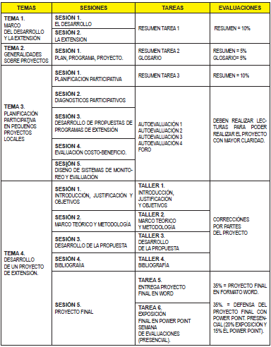 Cada sesión de clase contiene los objetivos instruccionales y el conjunto de actividades que deben ser realizadas por el participante para lograr su aprendizaje en un tiempo determinado, entre las cuales se tiene: lectura de material bibliográfico, búsqueda y revisión bibliográfica disponible en internet, elaboración de glosarios, tareas, taller, participación en foros, entre otros. Estas actividades están soportadas por diferentes documentos alojados en la plataforma o disponibles en internet, a los cuales se tiene acceso a través de un enlace colocado en el aula digital, en un espacio denominado recursos del plan de curso. Finalmente se diseñaron 4 autoevaluaciones para evaluar el proceso enseñanza aprendizaje virtual. Ver Cuadro 1.