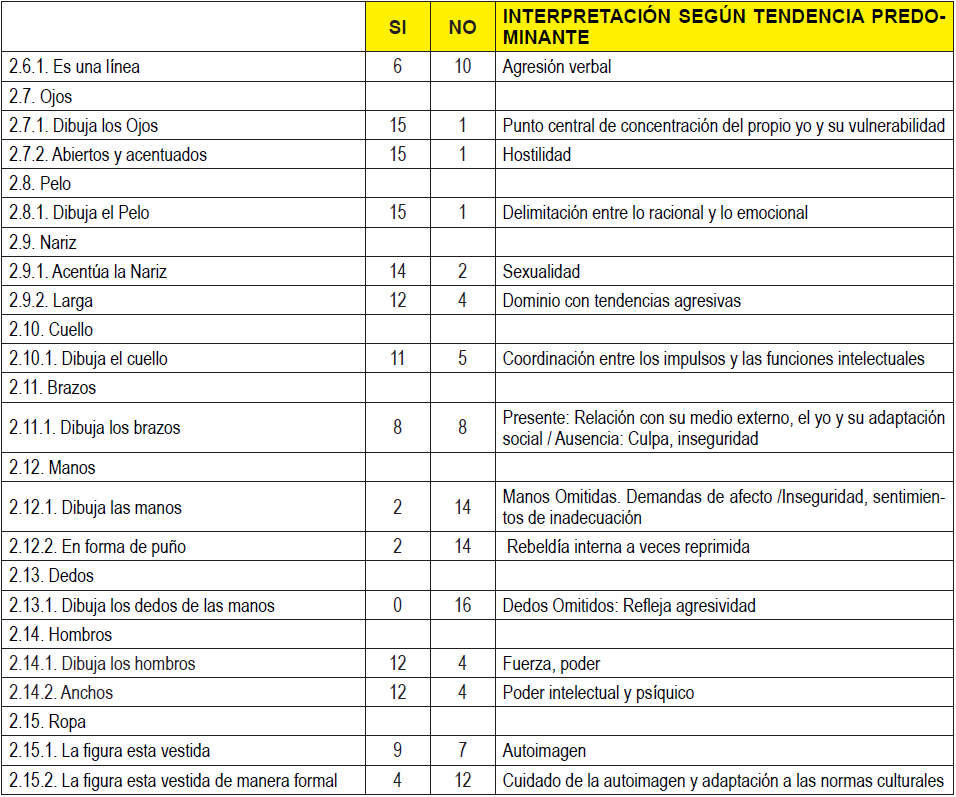Uno de los indicadores que más llama la atención es que la mayoría de los jóvenes solo representan la cabeza y parte del torso; en otras palabras, solo siete dibujos están completos, es decir, muestran cabeza, tronco y extremidades. Esto reafirma la interpretación de que en el grupo prevalece un comportamiento egocéntrico que responde con sentimientos de agresión a la presión ambiental.