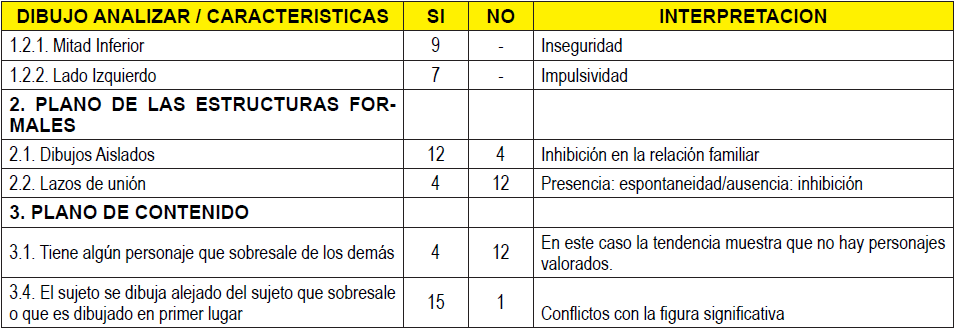 Una vez analizados la totalidad de los dibujos elaborados por los estudiantes, y siguiendo las pautas presentadas en la tabla anterior, se estableció una interpretación general tomando en consideración la tendencia predominante de todo el grupo para cada indicador.