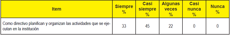 Se obtuvo que los directivos, en relación a la planificación y organización de las acciones a desarrollar en la institución, tienen una inclinación hacia la opción siempre y casi siempre; con una tendencia favorable entre ambos expresado en un 78% de la sumatoria de la interrogante planteada: organizan y planifican con frecuencia las actividades educativas para el buen desarrollo de la institución y poder lograr los objetivos proyectados por ellos. Hubo un 22% que consideró que algunas veces establecen las actividades a ejecutar en el plantel para el logro de los objetivos proyectados.