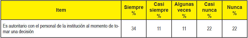 Sin embargo, se evidencia el autoritarismo con el personal a su cargo en la institución al momento de tomar decisiones en el plantel, con este estilo de gerentes educativos no se refleja una buena gestión interna, actuando de una manera no educada en la gerencia educativa. La situación descrita lo afirma López (op cit) indica que una de las principales características del directivo es tener paciencia, ser tolerante, pues hay algunas cosas que no las resuelve, al menos acertadamente y hay otras muchas que requieren paciencia y constancia.