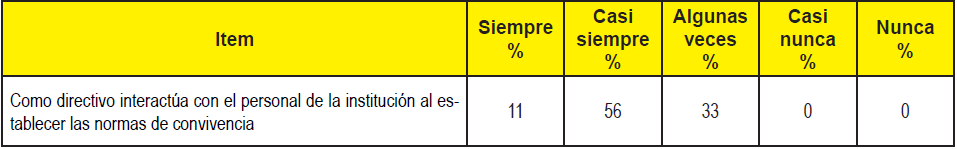 Asimismo, los resultados reflejan faltas internas en los directivos en el saber escuchar, dejarse aconsejar, pedir opinión, afectando la integración en el convivir y lo planificado en el plantel. De manera que se espera a un directivo permeable a las sugerencias y peticiones de los subordinados; pues si las ideas sugeridas no son aceptadas ni se razonan suficientemente y se altera la convivencia escolar. Lo manifiesta, Bravo (2006):