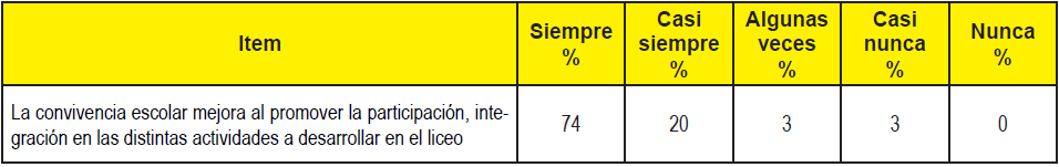 Este resultado lo consolida; García (2009) al destacar que “la organización es un sistema de actividades coordinadas entre ellas para la existencia de una organización con la finalidad de obtener un objetivo en común a través de reglas y normas expuestas para el buen funcionamiento del plantel (p.21)”. Igualmente, los datos obtenidos señalan; que los directivos planifican y organizan actividades en el plantel para el beneficio del personal y poder convivir en un ambiente educativo óptimo, convirtiéndose en espacios llenos de propósitos y compromisos. Brindando a todos los integrantes de la comunidad educativa: estudiantes, docentes, padres de familia, el objetivo de lograr el fortalecimiento, la interdependencia y la integración en el convivir escolar.