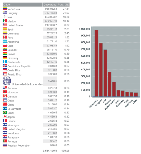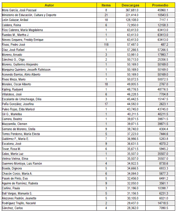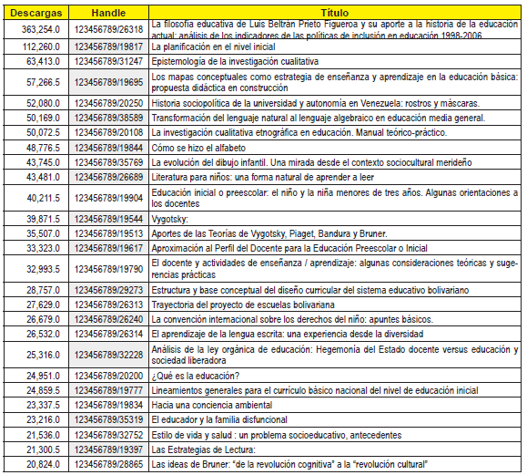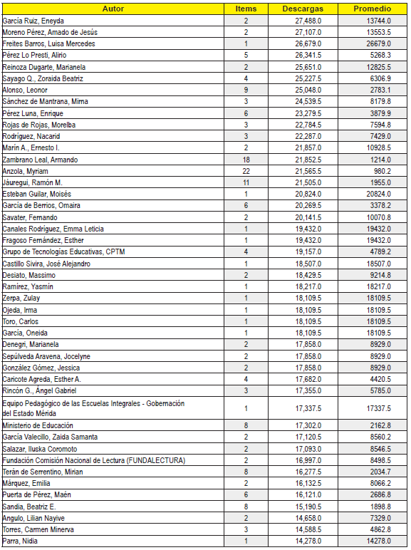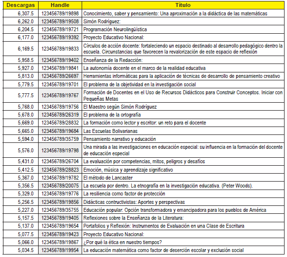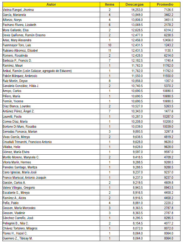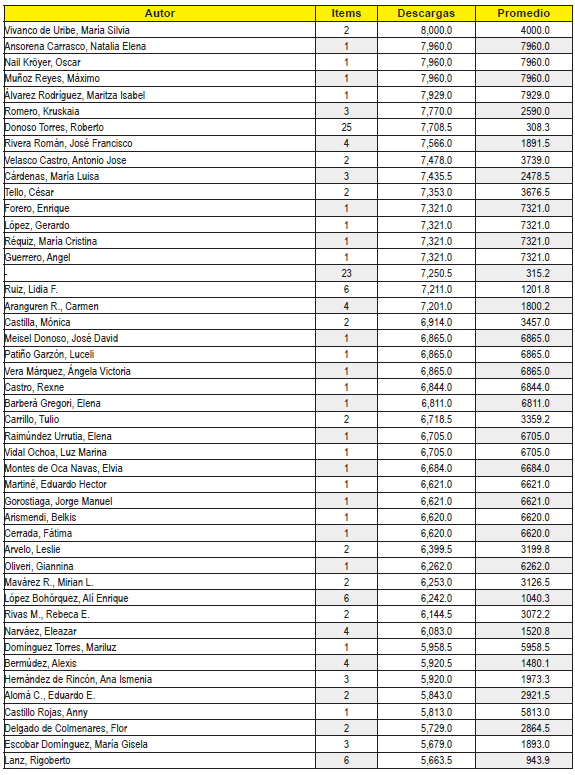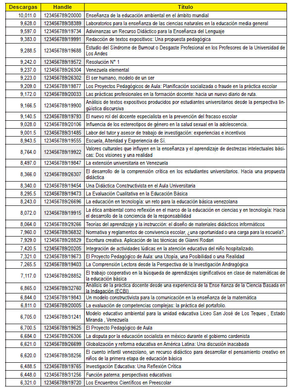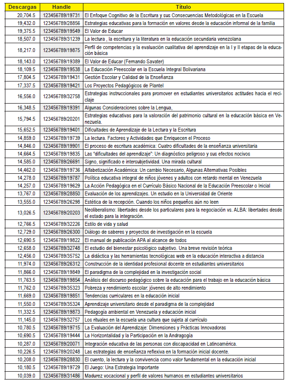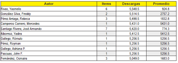 Esto lo podemos hacer porque el Repositorio Institucional Saber ULA nos proporciona con gran esmero la data solicitada, toda vez que su personal se esfuerza en apoyar la labor de los directores y editores que han alojado voluntariamente las revistas que a bien organizan, dirigen, producen y, por su puesto, se encargan de conseguir el financiamiento que la institución no dispone o no puede dar suficiente y oportunamente y que se requiere “a juro” para cada fascículo sea editado.