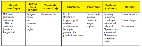 Richards y Rodgers (1986) explican que este método tiene como objetivo de estudio adquirir la capacidad de leer literatura en la lengua que se aprende, basándose en el aprendizaje de normas gramaticales (Cfr. Fuentes, 1993, p. 114). En este modelo se da prioridad a la lectura y la escritura, sobre la expresión oral, además la lengua de instrucción es otra lengua (la L1, la lengua materna) y esta misma sirve de referencia por sus similitudes y contrastes con la lengua que se está aprendiendo (L2). Se presenta el vocabulario nuevo en listas bilingües que deben memorizarse. La unidad base del aprendizaje es la frase, que se utiliza para ejemplificar los puntos gramaticales en los primeros niveles de enseñanza. La gramática se enseña de forma deductiva, primero se presentan las reglas gramaticales, luego la práctica con ejercicios de traducción.