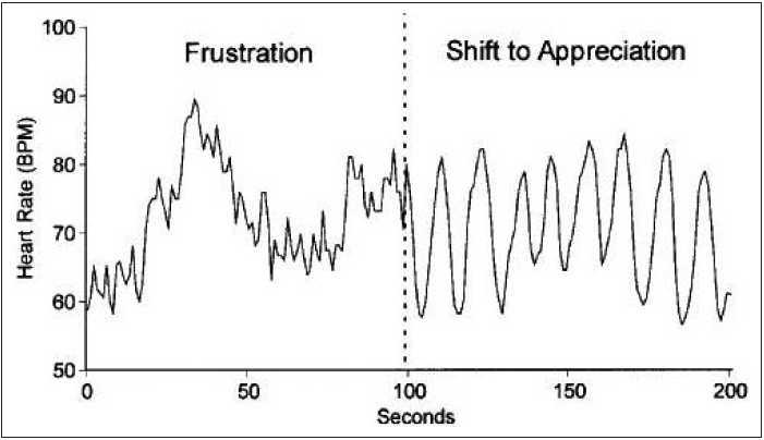 En contraste las emociones positivas, tales como la apreciación, el amor, la compasión se asocian a patrones coordinados en el ritmo del corazón, reflejando una mayor sincronización entre ambos sistemas autónomos nerviosos y una mayor eficiencia fisiológica. (McCraty et al. 1998, McCraty et al. 1999, Triller, McCraty y Atkinson, 1996).