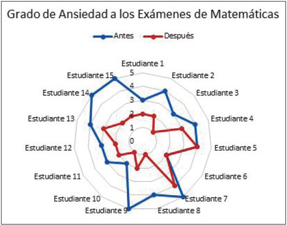 En la figura 3 se observa una línea azul, las cual representa las percepciones de los encuestados antes de tomar el taller de Heart Math,el promedio que los alumnos tenían inicialmente era de 3.77, y posteriormente después de tomar los talleres el promedio del nivel de ansiedad disminuyó a 2.2. En esta figura se observa que todos los alumnos disminuyeron su nivel de ansiedad a los exámenes de matemáticas, lo cual significa que los talleres ofrecidos son benéficos para reducir la ansiedad y el estrés para los alumnos.