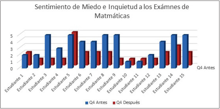 Con respecto a la pregunta del sentimiento de temor, e inquietud ante el examen de matemáticas, se observa en la figura 4 que la mayoría de los alumnos tuvieron una disminución después de tomar los talleres de Heart Math. El promedio en este rubro antes de tomar los talleres fue de 3.5, y posteriormente el promedio que los mismos alumnos tuvieron fue de 1.8, por lo que se presenta una mejoría en la mayoría de los alumnos con respecto a este sentimiento de temor e inquietud ante los exámenes de matemáticas.