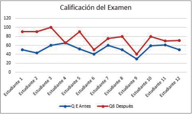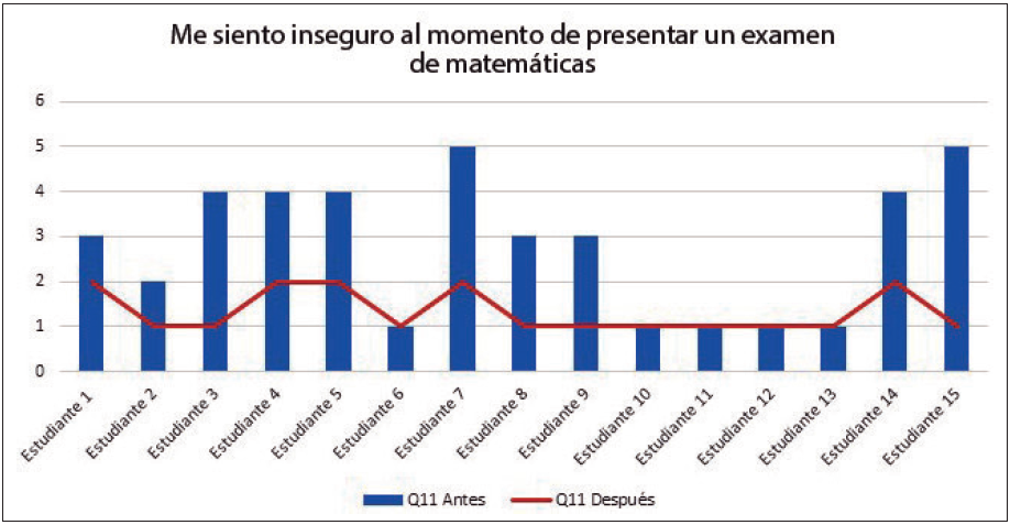 En la figura 6 se muestra en las barras azules la percepción de cada uno de los estudiantes con respecto al sentimiento de inseguridad al momento de realizar un examen de matemáticas, y en la línea naranja la percepción de cada uno de los mismos estudiantes después de haber tomado el taller.