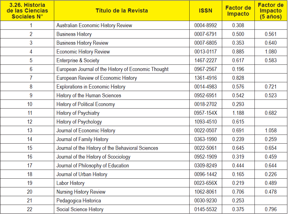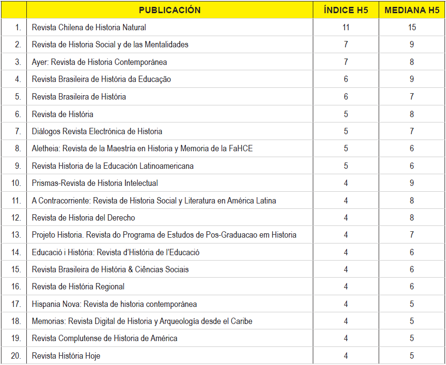 Un arqueo sobre el estado del facto h de la RHELA nos determina un mejor posicionamiento en el ranking de revistas latinoamericanas en el campo de la historia, que incluso está por encima de las 20 clasificadas. Al respecto presentamos ese registro como factor de medición que coinciden con Revista de Historia de la Educación Latinoamericana.