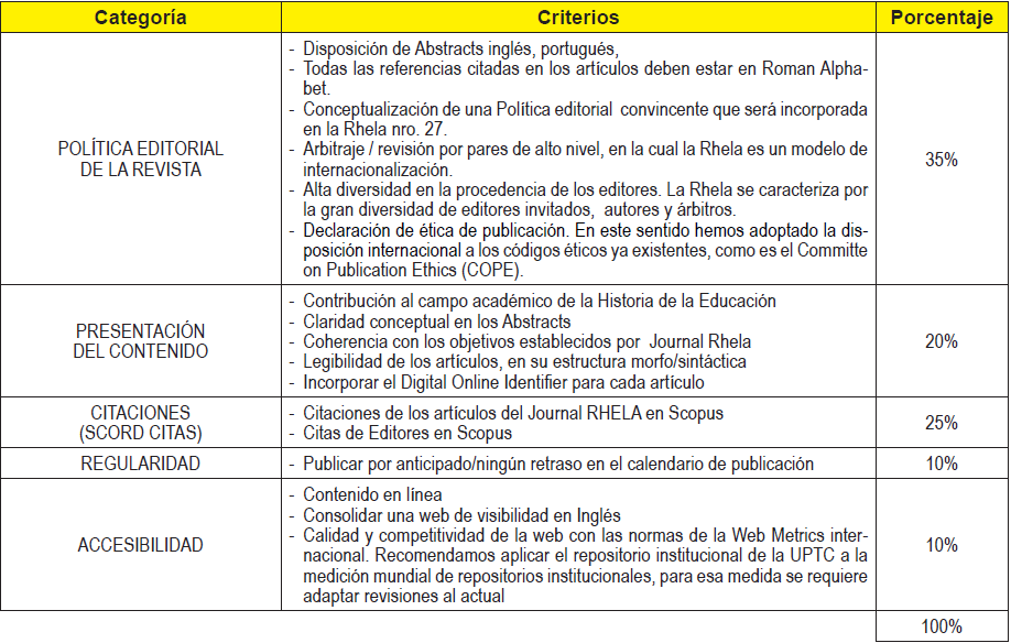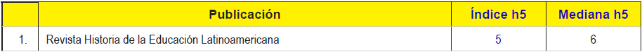 Fuente:https://scholar.google.com/citations?hl=es&view_op=search_venues&vq=Revista+de+Historia+de+la+Educaci%C3%B+3n+Latinoamericana, 22 septiembre de 2016.A continuación presentamos el baremo que hemos adaptado para la política editorial de la Rhela con miras a la aplicación en Scopus: