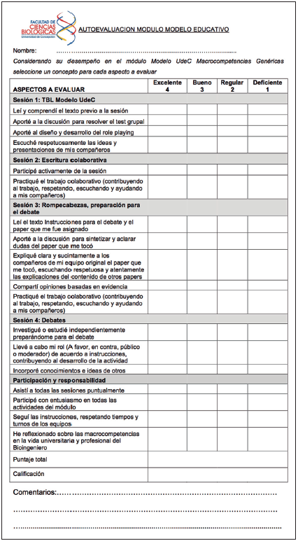 Se utilizó un texto en español que resume el modelo educativo UdeC y la descripción de las cuatro macrocompetencias modificado desde textos de uso interno elaborados por el Programa Competencias Genéricas Convenio de Desempeño UCO1204 (UdeC), el cual se entregó a los estudiantes la semana previa. Para la actividad de aplicación se les solicitó discutir situaciones en las cuales el Bioingeniero requiera desplegar una o más macrocompetencia genérica, seleccionar una e ilustrarla mediante role playing. Se evaluó el test individual (20%), test grupal (30%), actividad de aplicación (30%), autoevaluación y coevaluación de la participación con una escala de estimación conceptual (10% cada una).