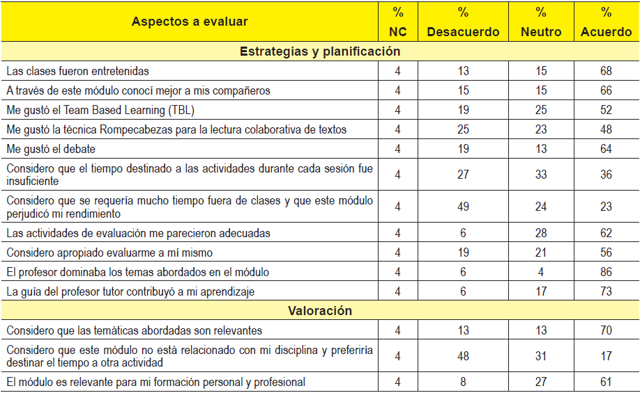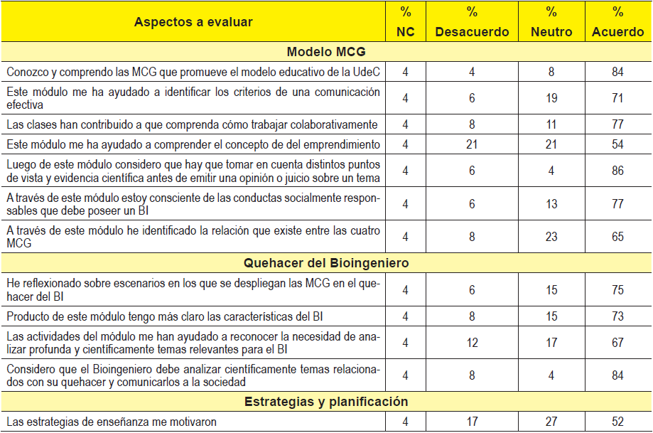 A través de la encuesta de percepción (tabla 1) 84% de los estudiantes manifestó haber comprendido las MCG que promueve el modelo educativo de la UdeC, con diferente porcentaje de acuerdo para cada una (71% comunicación, 77% trabajo colaborativo, 54% emprendimiento, 86% pensamiento crítico y 77% responsabilidad social). Sólo un 65% declaró identificar la relación entre las MCG. Por otra parte, a excepción de reportar “reconocer la necesidad de analizar profunda y científicamente temas relevantes para el BI” hubo acuerdo mayor al 70% en aspectos relacionados con el quehacer del Bioingeniero (73-84%). No se aprecia un acuerdo mayoritario en declarar motivación o agrado por las estrategias de enseñanza seleccionadas (48%- 66%), sin embargo, este resultado no se condice con los 33 comentarios positivos voluntarios, en los cuales se refiere al módulo repetidamente como entretenido, dinámico, didáctico, que promueve el conocerse con los compañeros y especialmente el trabajo colaborativo. No hubo acuerdo respecto de si el tiempo fue suficiente, lo cual se condice con lo declarado en los 28 comentarios voluntarios sobre aspectos negativos referidos principalmente a falta de tiempo, falta de seriedad de algunos compañeros al realizar las actividades, menor lectura y eliminar la lectura en inglés. El acuerdo respecto de la idoneidad de las actividades de evaluación fue 62% y hubo un 56% de acuerdo en realizar autoevaluación. Se apreció acuerdo mayoritario respecto de aspectos relacionados con la guía y dominio del tema del tutor (73 y 86%). Finalmente, sólo un 61% declaró que el módulo es relevante para su formación profesional y un 70% que las temáticas abordadas eran relevantes, no habiendo acuerdo sobre si el módulo está relacionado con la disciplina y si preferirían destinar el tiempo a otra actividad.
