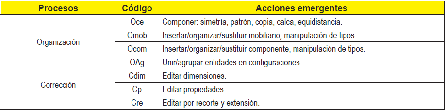 Los procesos cognitivos asociados fueron del tipo transformar, ordenar y corregir, tal y como se indica en el Cuadro 3. Los primeros se relacionaron con acciones repetitivas de posicionamiento de unidades de dibujo en el espacio de trabajo y definición de propiedades intrínsecas de elementos, repetición que cesa al obtener la definición más ajustada a lo concebido mentalmente. Asimismo, los procesos de organización permitieron estudiar o definir diferentes configuraciones, y las transformaciones correctivas, se ejecutaron para probar opciones diferentes por edición de parámetros de dimensión o propiedades a los subcomponentes de cada elemento.