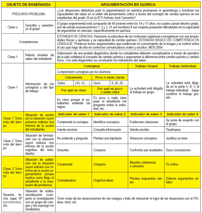 El instrumento de recolección de datos consistió en una rejilla de observación de situaciones didácticas para el grupo experimental diseñada por el profesor Armando Zambrano que explica cada una de las etapas de las situaciones didácticas, tiempo estimado, consignas, indicadores del saber y observaciones. (Ver Ilustración 1) Esta rejilla permitió la observación y valoración de las clases en cuanto a la aplicación de situaciones didácticas, en este caso específico el análisis de las producciones escritas de los estudiantes para comprender el rol de la argumentación en la conceptualización de cambio químico teniendo en cuenta la matriz de Toulmin.