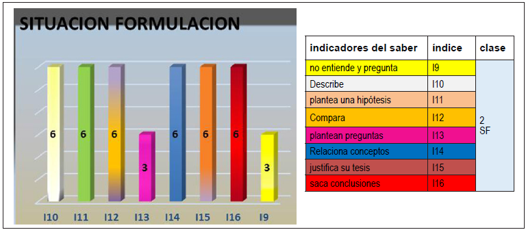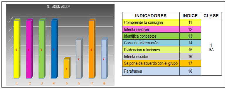 La situación acción busca evidenciar la acción del estudiante frente a unos obstáculos, las estrategias y el intento por resolver de la mejor manera lo planteado en las consignas, en esta fase se evidenció el trabajo colaborativo, la organización de las ideas, la presentación de los escritos, la consulta de información, la consulta al profesor, la consulta ente pares y el parafraseo en los textos, como un intento por dar explicaciones. Sin embargo solo una parte del grupo evidencia relaciones de los conceptos y un poco más de la mitad de los estudiantes intentan escribir y parafrasean.