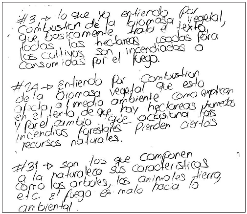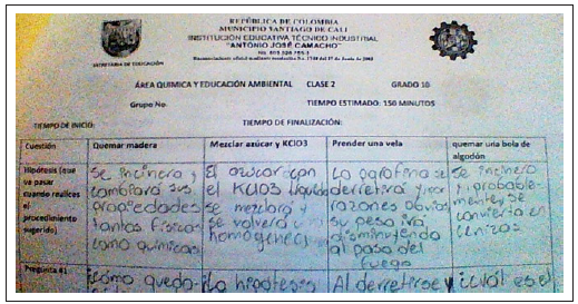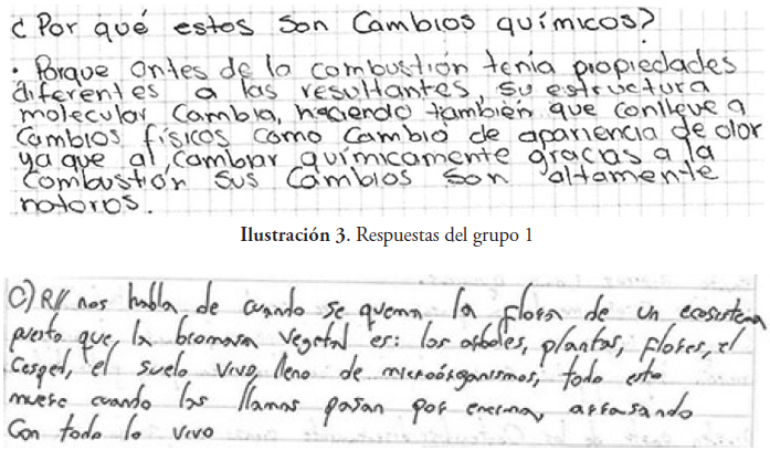 La segunda clase se desarrolló en el laboratorio con una guía paso a paso de los procesos que se llevarían a cabo. Para esta fase los estudiantes debían presentar un informe escrito con los requerimientos asignados desde el comienzo de clase. Y para la tercera clase se presentó un video, y se les solicitó resolver la pregunta problematizadora a través de la composición de un texto de tipo argumentativo. En la primera clase los estudiantes siempre estuvieron atentos a la directriz de la profesora. Después de la explicación de cambio químico y la lectura del texto “cuando arde el bosque se paga la vida”, los estudiantes, organizados en grupos de seis, respondieron a las preguntas. En esta primera intervención se identifica que los estudiantes se ciñen al texto, no van más allá de la trascripción de frases para responder las preguntas, no hay producción clara del estudiante.