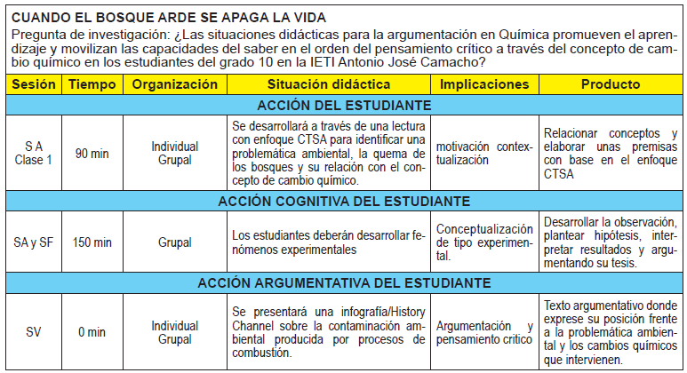 Para el caso específico de los estudiantes de décimo de la IETI Antonio José Camacho, se diagnosticó que a partir del resultados de diversas pruebas es necesario implementar estrategias didácticas para desarrollar la capacidad de construir explicaciones y comprender argumentos y modelos que den razón de fenómenos, y de establecer la validez o coherencia de una afirmación o de un argumento relacionado con un fenómeno o problema científico, a pesar de que hay muchas estrategias son pocas las que están soportadas bajo una teoría, en este trabajo de investigación se escogido la teoría de las situaciones didácticas de Guy Brosseau, teoría que nace desde las matemáticas y que desde esta investigación se innovó en la aplicación a las ciencias naturales, específicamente en química de grado 10. Para ello se escogió el concepto de cambio químico de tal forma que los estudiantes pudieran identificarlo y relacionarlo a través del enfoque CTSA (ciencia, tecnología, sociedad y ambiente), con el objetivo que desarrollaran argumentos sólidos y movilizarán saberes aportando al desarrollo del pensamiento crítico.