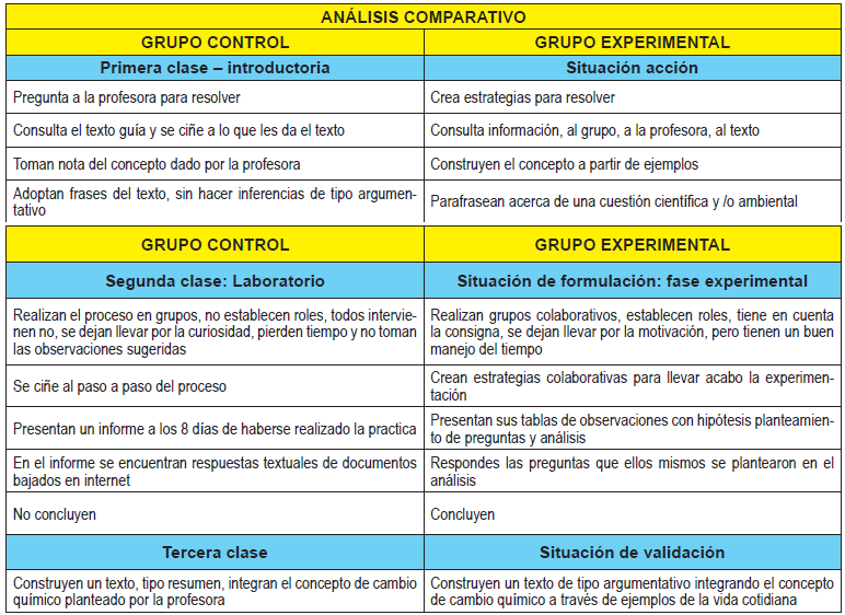 Cada fase de la situación fue fundamental para observar el comportamiento de los estudiantes y el avance en cuanto a su aprendizaje, que a través de los indicadores del saber, construidos a partir de la matriz de Toulmin evidenciaron, en cuanto a la capacidad argumentativa, la conceptualización, la relación de ciencia, tecnología, sociedad y ambiente que el grupo experimental, logró en un 50% de sus textos. Mientras que en el grupo control presentaron un comportamiento relativo a la clase tradicional, donde como era de esperarse, la expresión de distracción, falta de motivación, desconexión con el tema y un estado de confort al estar expuestos a un problema, a la espera que sea la profesora quien diga lo que hay que hacer y cómo hay que hacerlo. Sus textos fueron el ejemplo de resúmenes, textuales, algunos de ellos de tipo argumentativo, tenían dificultades en la relación del concepto y la organización de las ideas.