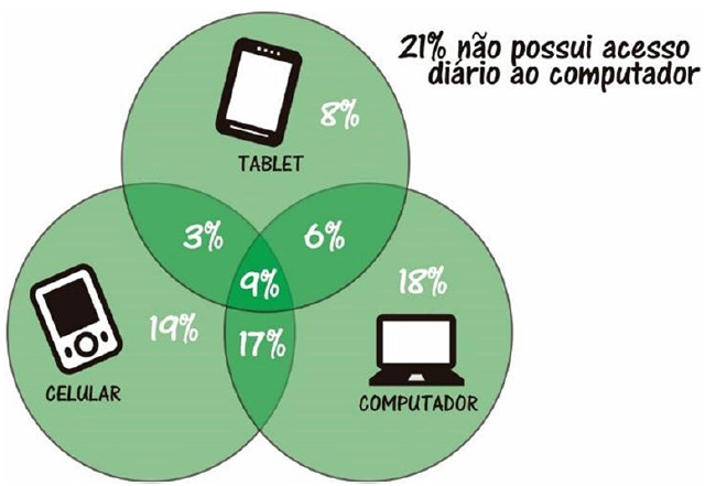 Com relação ao meio que fazem o acesso ao computador, e nessa questão foi explicado aos alunos que tablets e celulares também são computador, teve como grande líder o celular, onde 19% faz o uso apenas por ele, 17% usam ele e/ou o computador e 3% usam ele e/ou tablet. É de 18% a quantidade de alunos que fazem o uso apenas pelo computador e 6% os que usam ele e/ou o tablet. O diagrama da figura 10 ilustra esta ideia.