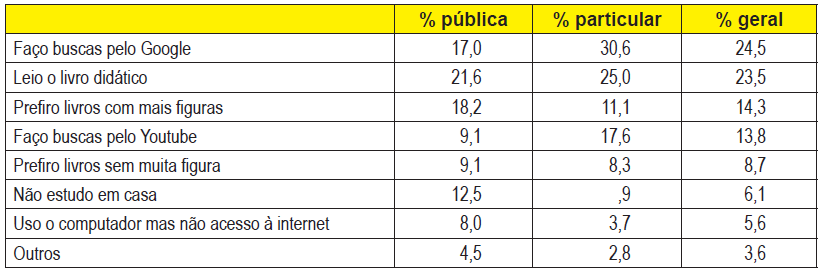 Os alunos pesquisados estudam de variadas formas, e conforme a pesquisa apresentou, estão imersos em um ambiente hipermidiático. Para a analise do quadro 2- formas de estudo é importante enfatizar que os alunos puderam assinalar várias alternativas, portanto a soma geral do quadro pode totalizar mais que 100%. Na liderança como fonte de informação para estudos tem-se a realização de buscas no Google, representando 24,5% no total de ambas as redes, e se mantendo líder nas escolas particulares com 30,6%. As escolas públicas possuem o livro didático como fonte principal de estudos, e as buscas no Google estão em terceiro lugar, sendo que a busca por livros com mais figuras obteve 18,2% das escolhas dos alunos. Isso vai ao encontro do fato já explicitado de que os alunos das escolas públicas ficam menos no computador em relação aos alunos da rede particular. O livro didático ocupa a segunda posição geral, seguido pela busca de livros com mais figuras. No quadro 2 os porcentuais são a relação das respostas com as redes de ensino, sendo assim, a porcentagem total não representa uma soma de público e privado, mas sim a relação de ambos com as respostas.