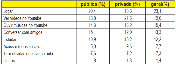 Porém, ao comparar as informações das redes, o ato de jogar está ligado a 29,4% dos respondentes na pública e a 18,6% na privada, isso faz com que esse ato ocupe a liderança na rede pública e a segunda colocação na privada. Esta tem o ato de ver vídeos no Youtube na liderança, com 21,6% enquanto na rede pública esse é o segundo colocado, com 16,8%, ou seja, as posições se invertem conforme a rede.