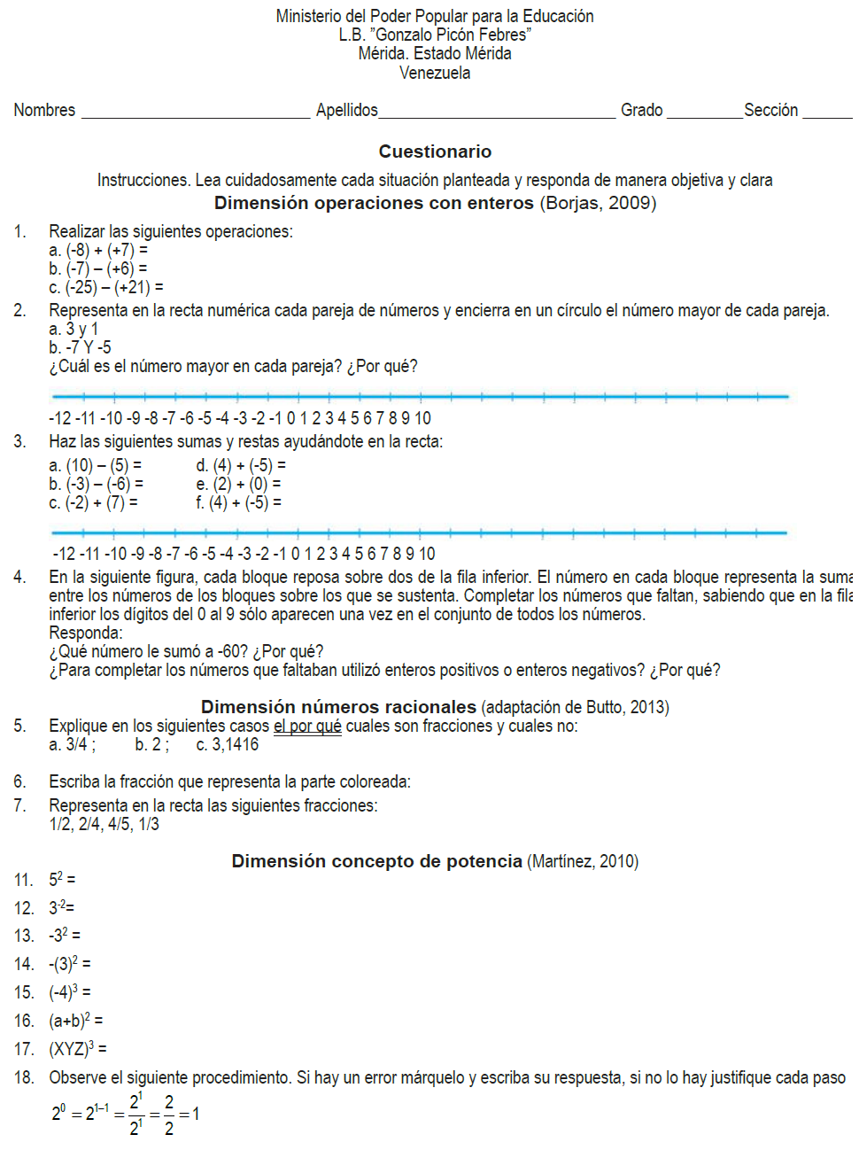 En trabajos anteriores sobre errores y dificultades conceptuales en el proceso de aprendizaje de la matemáticas, se han usado cuestionarios (González, Rey, Olivares y Parra, 2015; Vallejo y Tamayo, 2008), cuestionarios y entrevistas (Butto, 2013; Chavarria, 2014) para estudiar e interpretar los errores conceptuales en distintos temas de la matemática tales como: operaciones con números naturales, fracciones, ecuaciones lineales y potenciación entre otros. En esta investigación se diseñó y se aplicó un cuestionario cuyos ítems son adaptaciones de otros cuestionarios ya validados reportados en las publicaciones citadas. Es de aclarar que en el cuestionario existe un salto en el número de ítems debido a que se quiso investigar la dimensión de ecuaciones lineales, pero se tomó la decisión de eliminarla debido a que las respuestas eran muy incoherentes quizás debido a las dificultades que presentaron los participantes en las otras dimensiones.
