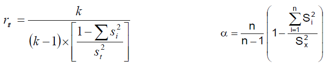 Donde: rtt o α: coeficiente de confiabilidad de la prueba o cuestionario, k o n: es la longitud del test, (el número de ítems que lo componen), S 2: Varianza total del instrumento (varianza de las puntuaciones totales en el test), Σ: Sumatoria de las varianzas de los ítems.
