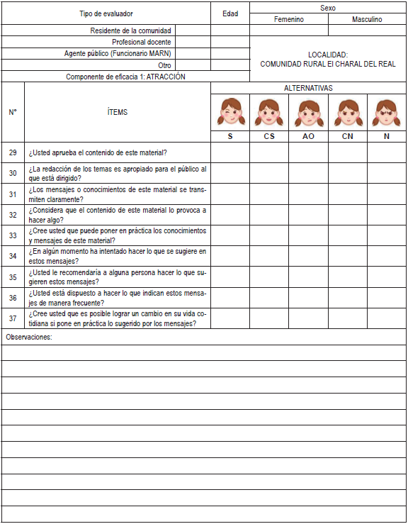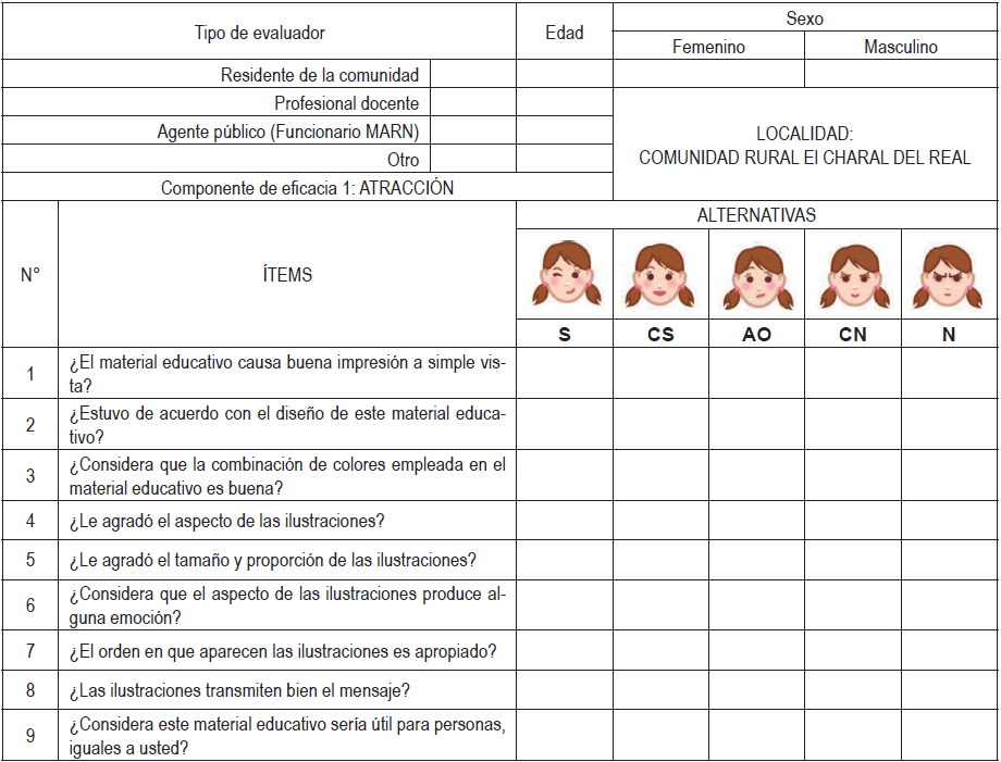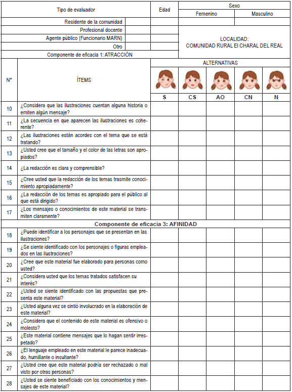 En el diseño de la ficha de validación se tomó en cuenta tanto el grupo meta, como el tipo del material elaborado. Se trabajaron los ítems de acuerdo con los cinco criterios mencionados anteriormente (atracción, comprensión, afinidad o compatibilidad, aceptación, inducción a la acción). La ficha de validación estuvo conformada por 37 ítems, incluye preguntas abiertas, redactadas de modo que cada individuo con su actitud diferente lo contestara de manera diferente, siendo capaz de expresar juicios de valor, tal como lo sugiere Likert (1932).