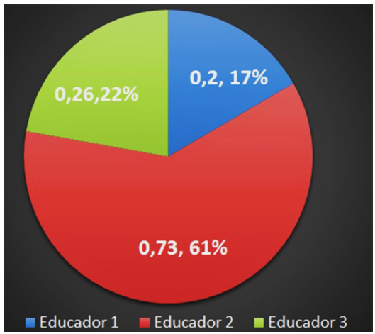 El educador con mejor desempeño, es decir, con una mayor cantidad de indicadores presentes en las jornadas observadas, es el educador 2, en cuya práctica, fue posible observar 11 de un total de 15 indicadores. En general, los indicadores observados en este educador se centran en contenido matemático, concepto número y geometría, así también, en las estrategias didácticas que utiliza para favorecer el aprendizaje de los niños. En cambio, en el educador 1 es observable un bajo nivel de logro de los indicadores propuestos, ya que en la intervención que el profesional realiza durante la jornada, son escasos los elementos que apuntan hacia el desarrollo de las matemáticas o la incorporación de estrategias didácticas que favorezcan habilidades matemáticas en los niños