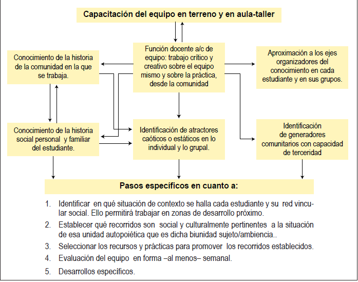 - El planteo que presentamos, parecería no ser innovador a primera vista; pero debemos notar que se trata de un cambio rotundo en el punto de partida: ya no se trata de la actividad escolar centrada en la transmisión de ciertas ‘competencias’ que capaciten al estudiante para desempeñarse en el mundo globalizado y en la competencia, sino que se trata de partir de la situación de vida, histórica, del sistema autopoiético sujeto y del sistema comunidad.
