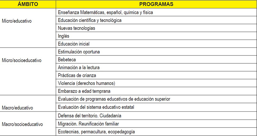 Un tercer ámbito, se ubica en un escenario macro y corresponde al Sistema Educativo Estatal. Los programas identificados responden a procesos de evaluación en el que se genera información para una instancia superior. El primer programa responde a la necesidad de conocer las condiciones mínimas en las que ocurre el proceso educativo en el estado de Oaxaca, implica un proceso de diagnóstico e investigación. La información generada en ambos programas corresponde al plano de las políticas públicas actuales.