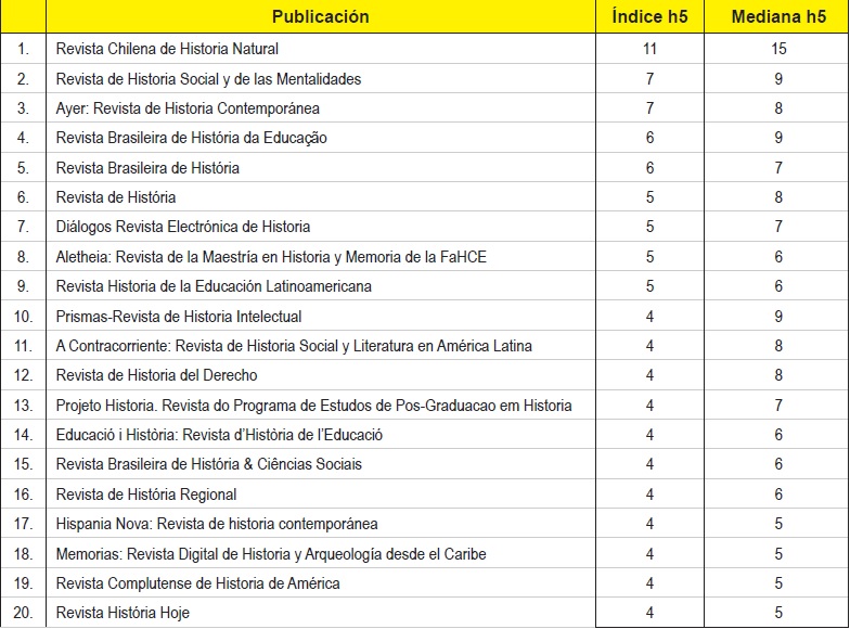 En el caso de la RHELA estamos con potencialidades ciertas de estar acreditados por Scopus, sólo que nos falta visibilizar las publicaciones por autores en el GSM, de hecho estamos con mejor índice h que algunas de los 20 revistas que responden al indicador Historia.