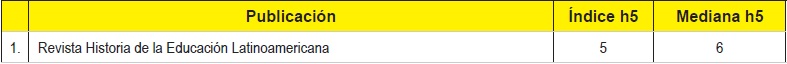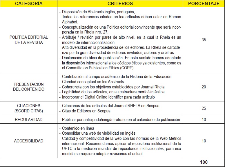 Fuente:https://scholar.google.com/citations?hl=es&view_op=search_venues&vq=Revista+de+Historia+de+la+Educaci%C3%B3n+Latinoamericana, 22 septiembre de 2016.A continuación presentamos el baremo que hemos adaptado para la política editorial de la Rhela con miras a la aplicación en Scopus: