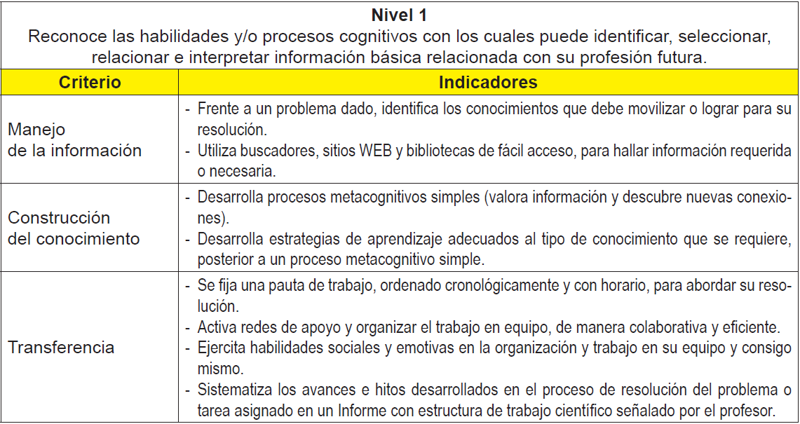 En Nivel 1, un estudiante evidencia que Maneja la información, cuando demuestra que Gestiona la información integrando de manera restringida técnicas adecuadas de recogida de datos y diversas fuentes de consulta básica para la organización y el control de procesos que permitan resolver problemas simples de su área académica o profesional. La Construcción del conocimiento se evidencia al interactuar con la información, desarrollando a través de operaciones mentales básicas aportes restringidos al conocimiento de su área de desarrollo académico o profesional. Por último, la capacidad de Transferencia se evidencia cuando el estudiante Socializa el conocimiento construido en grupos de clase o cercanos, e identifica las aplicaciones posibles del conocimiento generado.