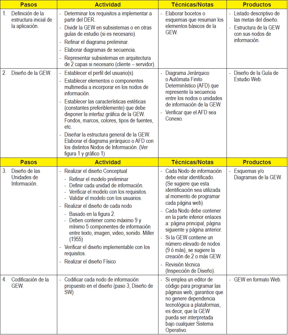 El G-Web adapta elementos del Método White-Watch, Autómatas Finitos Determinísticos y aportes del campo psicológico vinculados a la memoria de corto plazo, para plantear un marco metodológico que describe las actividades necesarias para desarrollar una Guía de Estudio Web con su respectiva documentación.