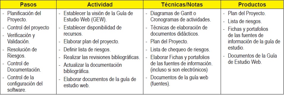 El planteamiento está basado en White-Watch, que es un método para el desarrollo de proyectos pequeños de software propuesto por Barrios y Montilva (2013). El mismo es un marco metodológico que describe el conjunto estructurado de actividades necesarias para desarrollar un producto de software pequeño, de baja complejidad y con documentación técnica precisa. En este se trata de disminuir la elaboración detallada de documentos y/o especificaciones del proceso de desarrollo, permitiendo, al docente, dedicar más tiempo a las actividades de implementación e implantación de versiones operativas y evolutivas de la Guía Web. Por tanto, las actividades gerenciales de control de calidad y de configuración, se limitan a prescribir las actividades básicas de control de cambios, validación y verificación de especificaciones técnicas, de productos parciales y finales.