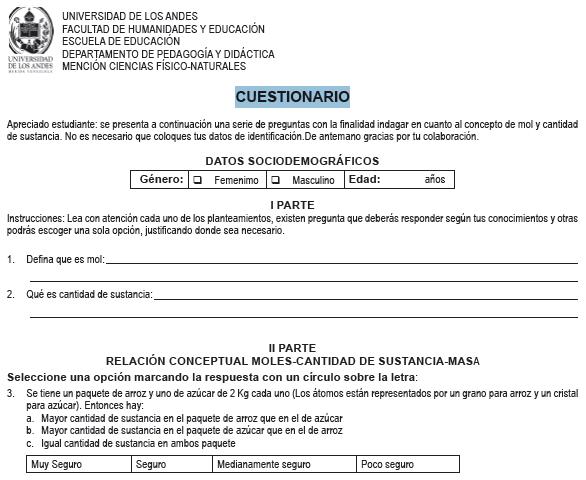 El cuestionario con el cual se obtuvo la información del estudio, está divido en dos partes. La primera consta de preguntas abiertas sobre el concepto de mol para averiguar las concepciones e ideas de los participantes sobre mol y cantidad de sustancia. La segunda parte consta de cuatro dimensiones: relación Moles-cantidad de sustancia-masa, relación conceptual Moles-concentración, relación Mol-PV=nRT y relación Mol- Estequiometría. Para dar veracidad de la validez del instrumento se consideró el juicio de tres expertos los cuales consideraron que la validez del instrumento se evaluara utilizando el Coeficiente de Validez de Contenido (CVC) planteado por Hernández (2002), Se obtuvo para el criterio pertinencia un valor de 0,9784, para el criterio coherencia con el indicador 0,9734, en claridad 0,9484 y para redacción 0,9372; lo cual indica que el instrumento tiene una validez y concordancia excelente con una la diferencia marginal obtenida que se debe a las mínimas diferencias por exceso y defecto de 0,0001.