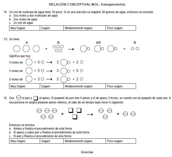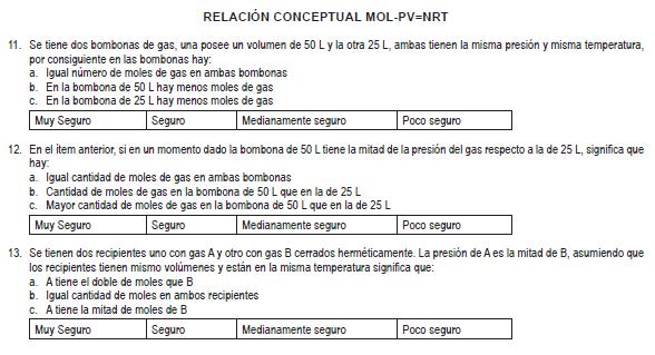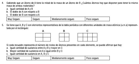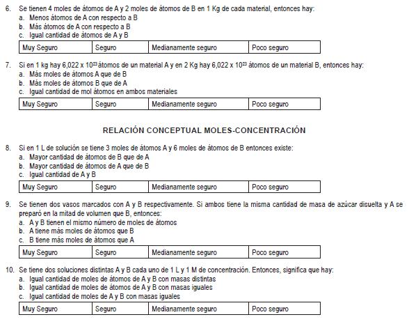 Conjuntamente a la definición, se indagó en las diversas relaciones que existen con el tema de mol y cantidad de sustancia descritas a continuación, donde las opciones marcadas con asterisco (*) indica la respuesta correcta.