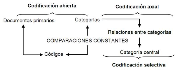 Las 3 fases analíticas del proceso (Fig. 1) constituyen las bases del microanálisis utilizado. La primera fase, la codificación abierta, corresponde a un microanálisis detallado, “para generar categorías iniciales… por medio del cual se identifican los conceptos” (Strauss & Corbin, 2002, p. 110).
