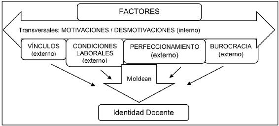El análisis realizado utilizando la teoría fundamentada (grounded theory), nos lleva a establecer que los factores que operan a nivel de vínculos, condiciones laborales, perfeccionamiento y burocracia van moldeando la identidad de los profesores de inglés. Estos factores están ligados transversalmente por medio de las motivaciones y desmotivaciones que se van desencadenando desde la perspectiva del significado que cada docente da a las interacciones multifactoriales.