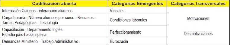 Los códigos de motivaciones y desmotivaciones fueron categorizados transversalmente. La naturaleza de esta transversalidad radica en que las motivaciones y desmotivaciones están ligadas a las cuatro categorías encontradas.