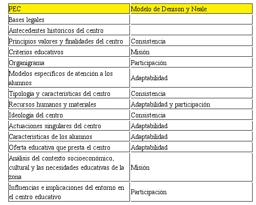 En suma, en el PEC se establece el carácter propio que confiere personalidad al centro al integrar las variables contextuales de la organización, el planteamiento ideológico y los principios de identidad, la concepción pedagógica y el modelo organizativo estructural, estando todo ello relacionado de forma directa con la cultura organizacional y específicamente con los factores del modelo de Denison y Neale (1994, 2000) que ya han sido descritos (ver Tabla 1).
