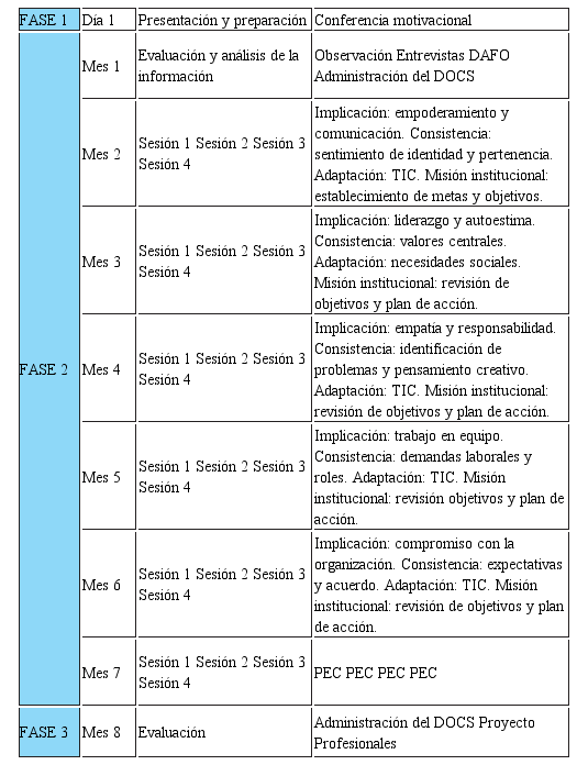 La elección de los temas que aparecen es fruto de las entrevistas realizadas a los directivos/as de los centros, en los que destacaron la importancia de trabajar aspectos tales como: la comunicación, el liderazgo, la participación, la motivación, o la capacidad de resolver conflictos tanto en lo referente a las familias, el alumnado o los docentes entre sí. Del mismo modo, recalcaron la necesidad de trabajar valores comunes como: la tolerancia, el diálogo, el respeto, la responsabilidad, la creatividad y el trabajo en equipo. Finalmente, como los propios entrevistados recomendaron, en el penúltimo mes de la intervención sería muy conveniente dejar un espacio para poder integrar en el proyecto educativo del centro las actualizaciones, habilidades, objetivos o ideas que se hayan ido adquiriendo a lo largo del proyecto. Este es un aspecto relevante que las y los directivos destacaron en sus entrevistas. Porque como nos dijeron, uno de los motivos por los cuales han tenido dificultades en los centros, ha sido por la falta de claridad o conocimiento de los objetivos que se perseguían, por ello en el PEC tienen que quedar establecidos de forma clara y precisa.