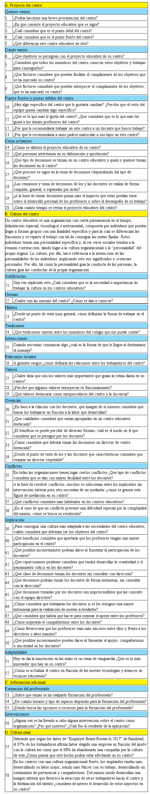 El siguiente apartado de la entrevista se refiere a la cultura del centro buscando entender las normas, los hábitos, las tradiciones, las interacciones, las relaciones sociales, valores, creencias y el manejo del conflicto, así como el nivel de implicación de los trabajadores en el centro y la adaptabilidad de éste a las demandas sociales.