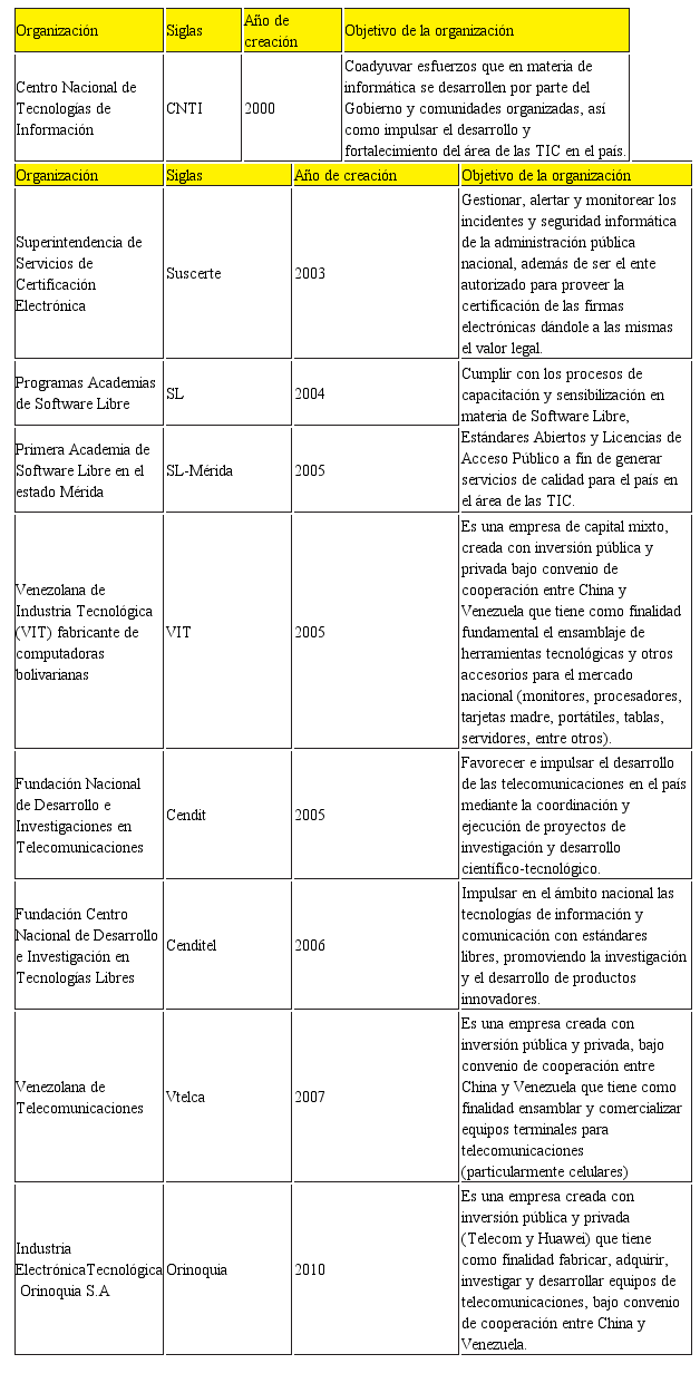 Muchas han sido las organizaciones que han sido creadas a lo largo de los últimos años en ocasión a impulsar las TIC, en ese sentido se ha elaborado una tabla que incluye una breve descripción de las mismas. Dichas organizaciones.