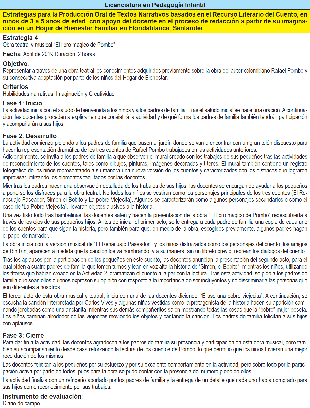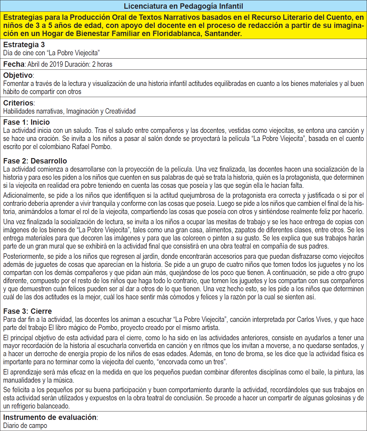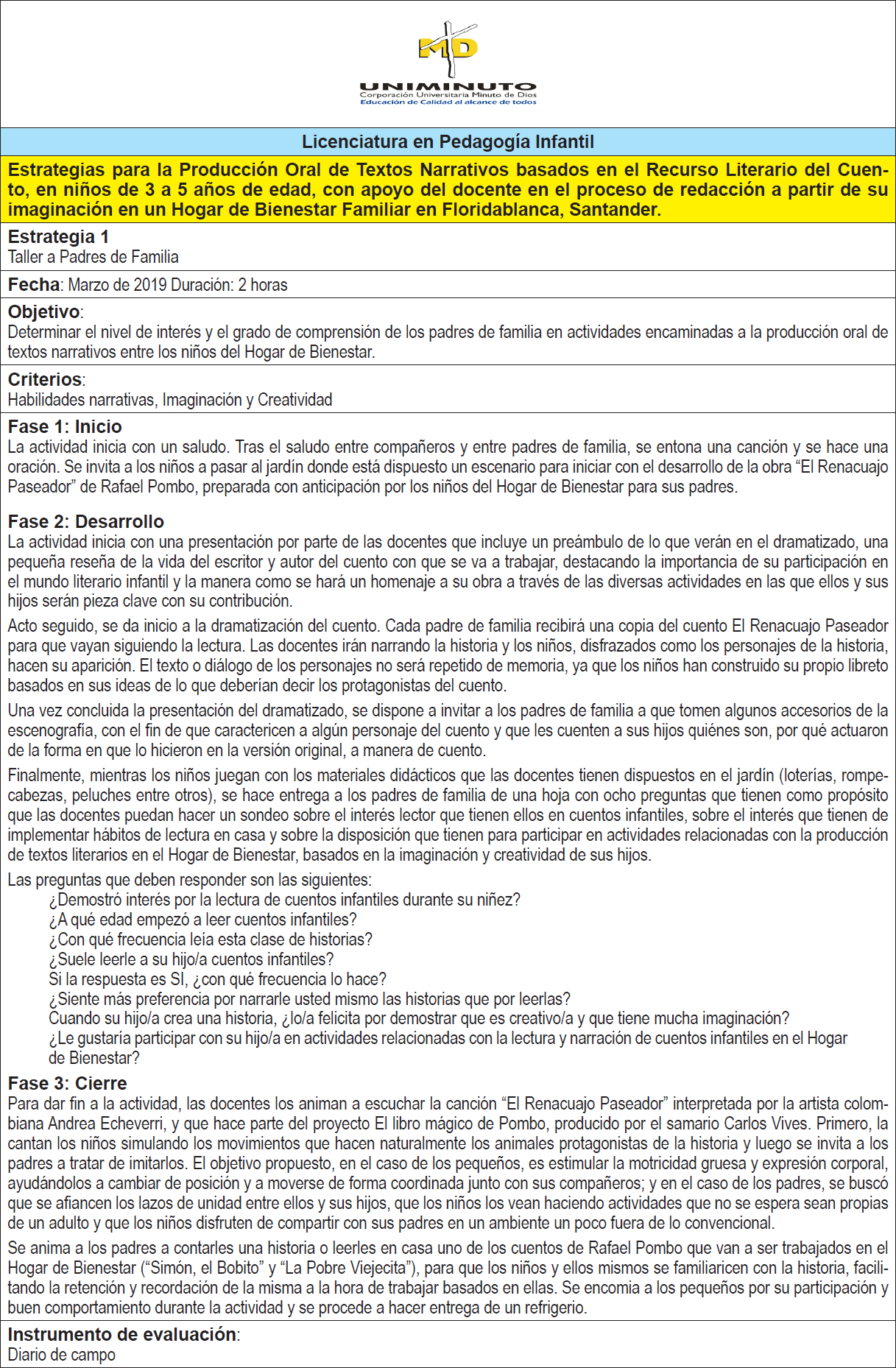 La investigación realizada surge a partir de la observación cumplida en el “Hogar de Bienestar Familiar”, con niños en edades comprendidas entre 3 y 5 años, donde se hace necesario implementar diversas estrategias que fomenten el desarrollo del hábito de la lectura, promoviendo el interés de los niños por leer y escribir más, mediante actividades que les permitan realizar cortas narraciones en conjunto con sus docentes; se busca así establecer los lazos para el fortalecimiento del proceso de enseñanza–aprendizaje, ya que el niño se va a desarrollar en un espacio social, educativo, cultural en el cual es imprescindible afianzar el proceso de lectura y escritura.
