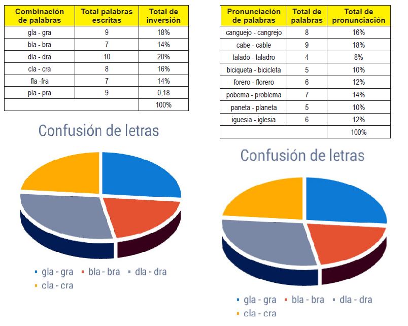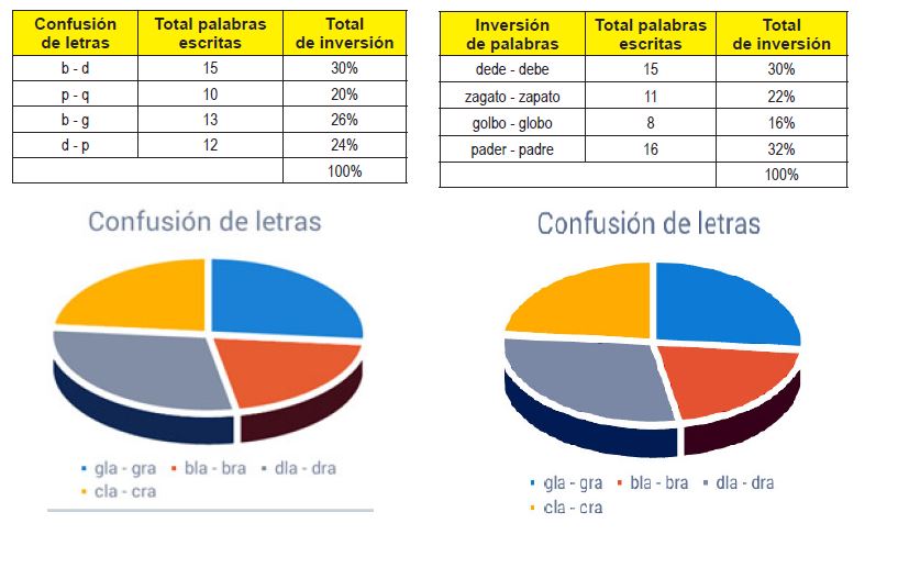 A continuación, presentamos dos gráficas; una sobre la confusión de letras y otra de la inversión de palabras que hace la estudiante al escribir un texto.