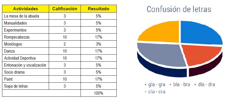 Las actividades se diseñaron teniendo en cuenta, las falencias observadas en el diagnóstico, para un total de once actividades, clasificadas en tres secciones; auditivas, kinestésicas y visuales, cada una con una duración aproximada de 45 minutos, utilizando variedad de material, y los diferentes espacios que brinda la institución. Las actividades programadas fueron las siguientes: danza, experimentos, rompecabezas, monólogos, dramatización, construcción de ensayos, actividad deportiva, manualidades, entonación, Paint y sopa de letras.